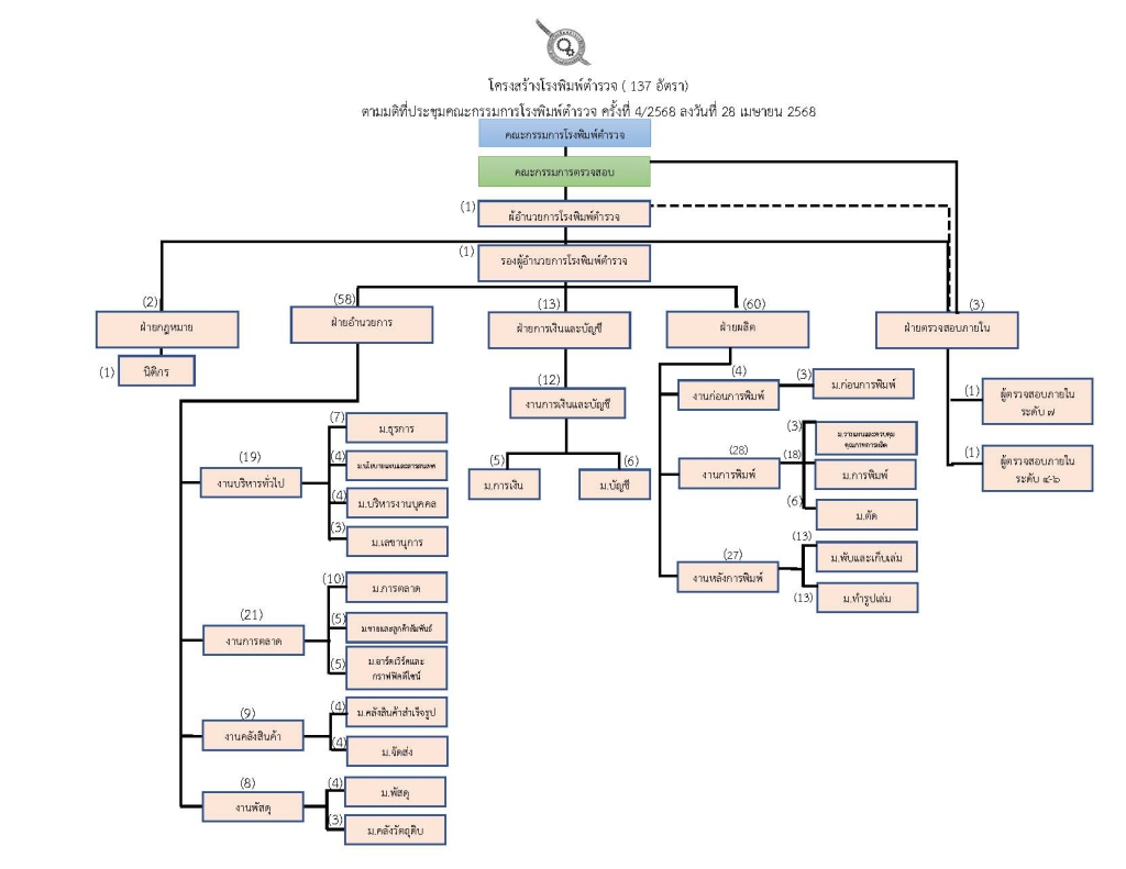 5. ฝ่ายตรวจสอบภายใน เป็นหน่วยงานที่ขึ้นตรงกับผู้อำนวยการฯ มีอำนาจในการตรวจสอบการดำเนินงานภายในองค์การทุกส่วนงาน ควบคุมและตรวจสอบการดำเนินงานภายในโรงพิมพ์ตำรวจ